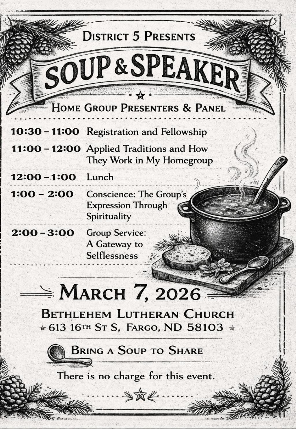 Location: Bethlehem Lutheran Church – 613 16th St. S. Fargo, ND 58103 – no charge for this event, Bring a Soup to Share